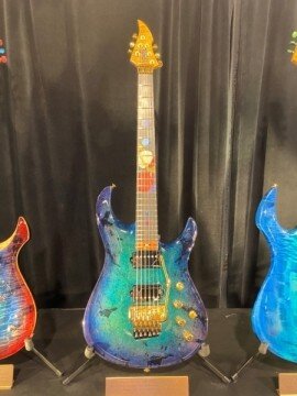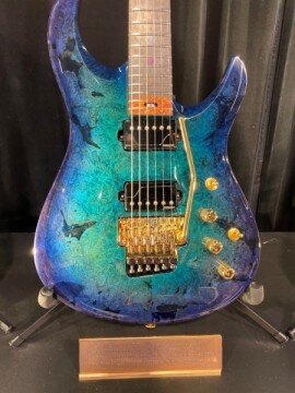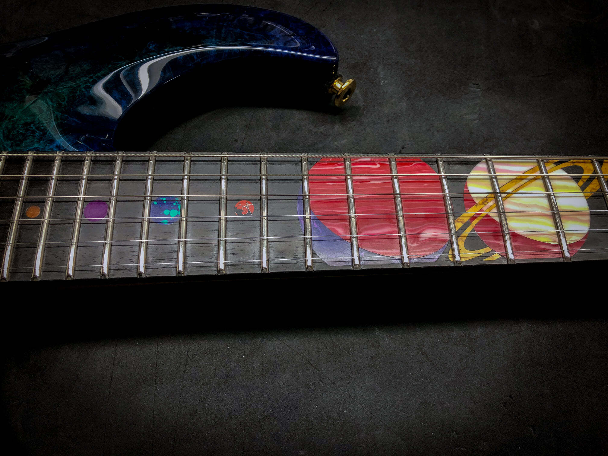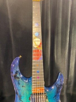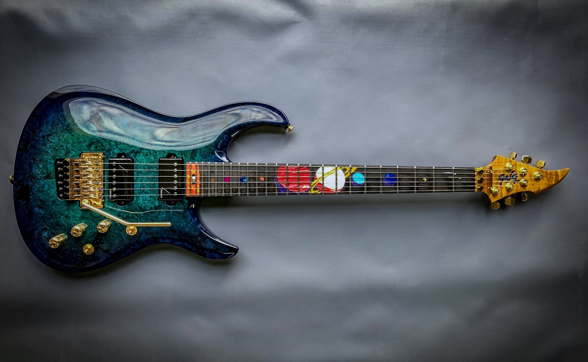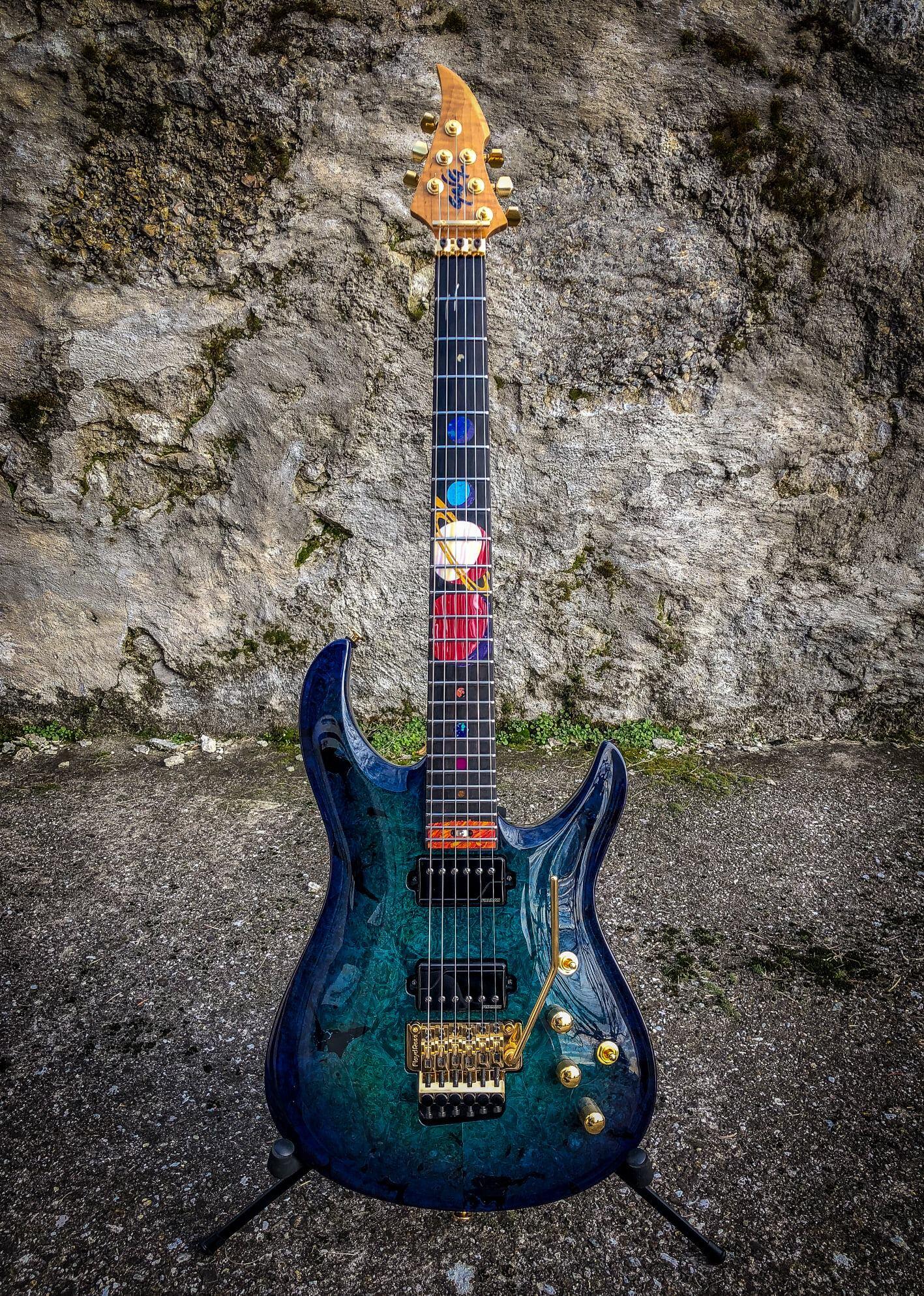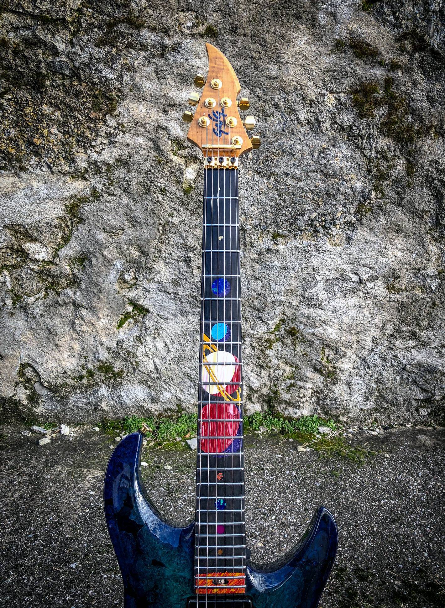 Giulio is out of Switzerland and met them a number of years ago. This is my fourth guitar from Giulio and this is the model BREA model. And it’s kind of my design and his magic, the solar system. So, of course, we have the sun and all the planets in order all the way up to. Yeah, Pluto’s in there. Sorry, it’s still a planet for me. It may be a dwarf planet, so. Yeah. Neat stuff. You know he is an absolute magician.