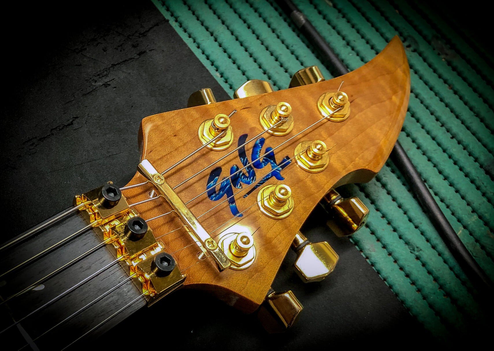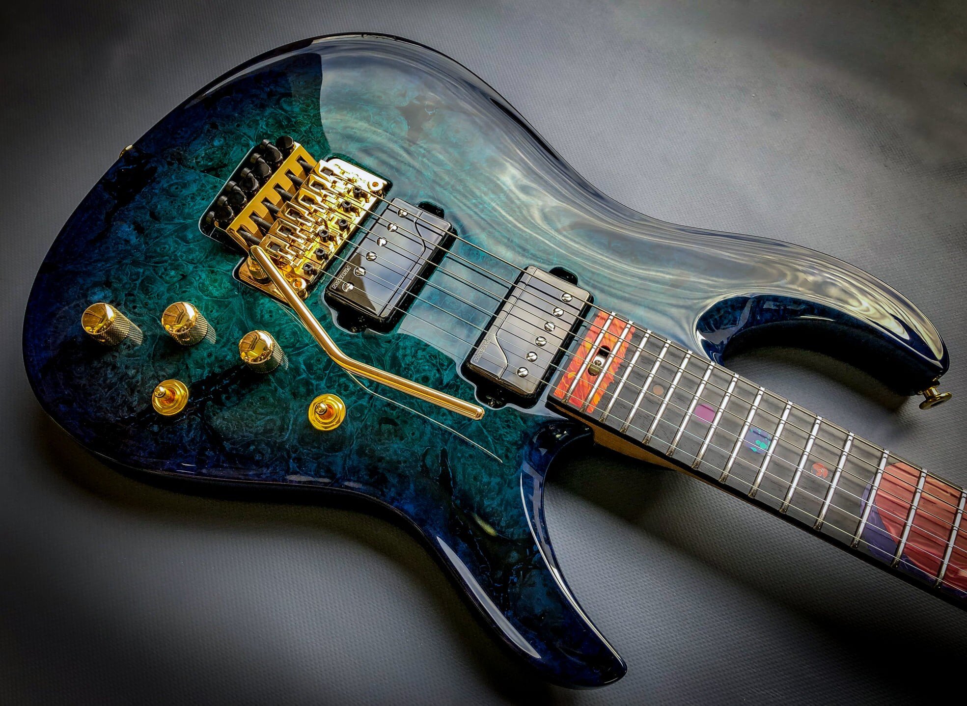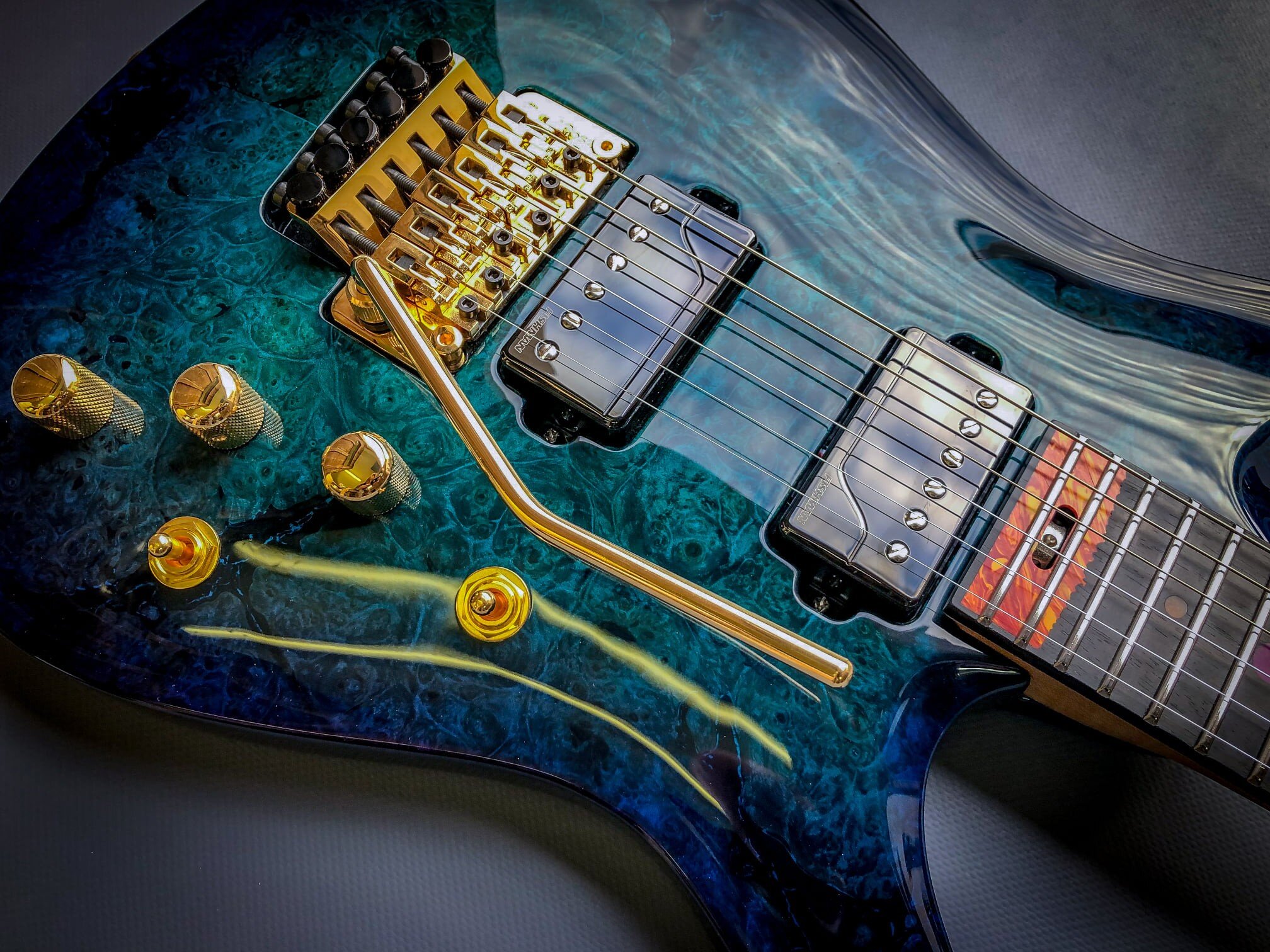 I’ll talk about him in a moment. Let me just tell you about the rest of the guitar. So we have an old top here that is a very, very, very old and expensive piece of wood. I’m running a Floyd Rose original gold. Obviously, the fretboard is ebony, black ebony.